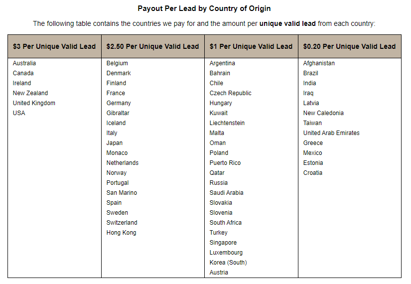 Si elige el programa Pago por cliente potencial, ganará hasta $ 3 por cada miembro que cree una cuenta gratuita. No importa si el usuario alguna vez gasta dinero en el sitio, se le pagará independientemente. Esto puede generarle más dinero a corto plazo, ya que los miembros no tienen que gastar dinero, pero a largo plazo probablemente gane más con el programa RevShare. La cantidad que gana por cada registro gratuito depende del país de origen de cada miembro. Solo 6 países pagan $ 3 por cada registro. Tenga esto en cuenta cuando compre tráfico. Podría ser inteligente comprar tráfico de países que pagan más por registro.